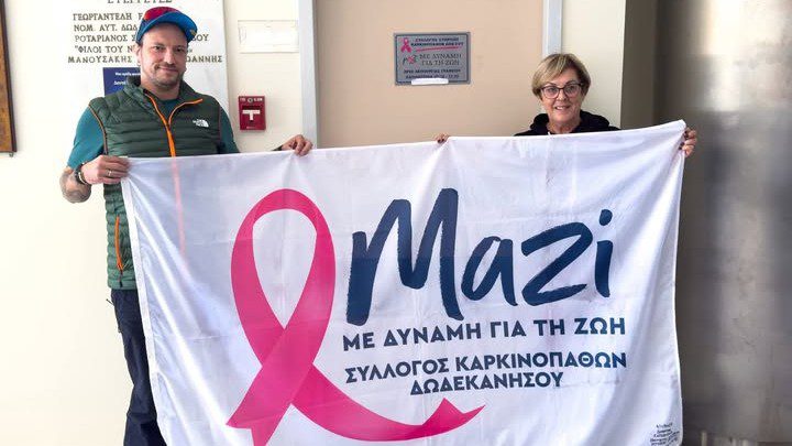 «Ο Σύλλογος Στήριξης Καρκινοπαθών Δωδεκανήσου “ΜΑΖΙ Με Δύναμη για τη Ζωή” υποδέχθηκε με συγκίνηση τον συμπολίτη μας Δημήτρη Καραβόλια, ο οποίος, μετά την επιτυχή ανάβαση στον Μύτικα – την υψηλότερη κορυφή της Ελλάδας στα 2.918 μ. – επέστρεψε στη Ρόδο για να παραδώσει στα γραφεία μας συμβολικά τη σημαία που ύψωσε στον Όλυμπο.