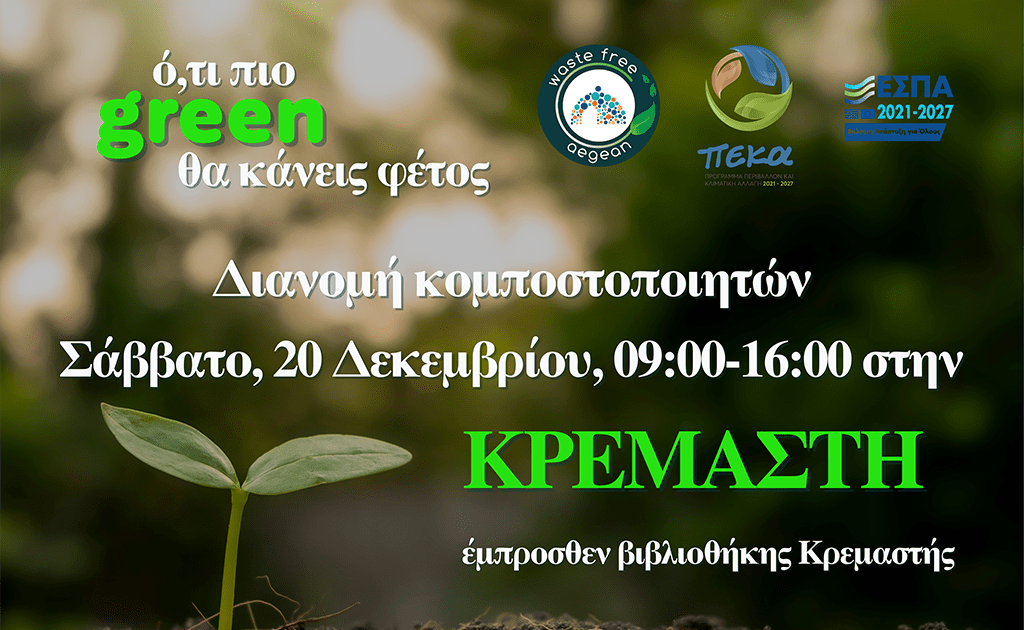 Το Σάββατο 20 Δεκεμβρίου 2025, από τις 09:00 έως τις 16:00, η Κρεμαστή γίνεται σημείο αναφοράς για την κομποστοποίηση, με τη διανομή κομποστοποιητών μπροστά από τη Βιβλιοθήκη Κρεμαστής, δίπλα στο Πολιτιστικό Κέντρο, στην καρδιά της Κρεμαστής.
