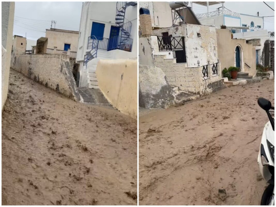 Σε ποτάμια μετατράπηκαν οι δρόμοι σε αρκετές περιοχές της Σαντορίνης, μετά την έντονη βροχόπτωση που σημειώθηκε νωρίτερα στο νησί.