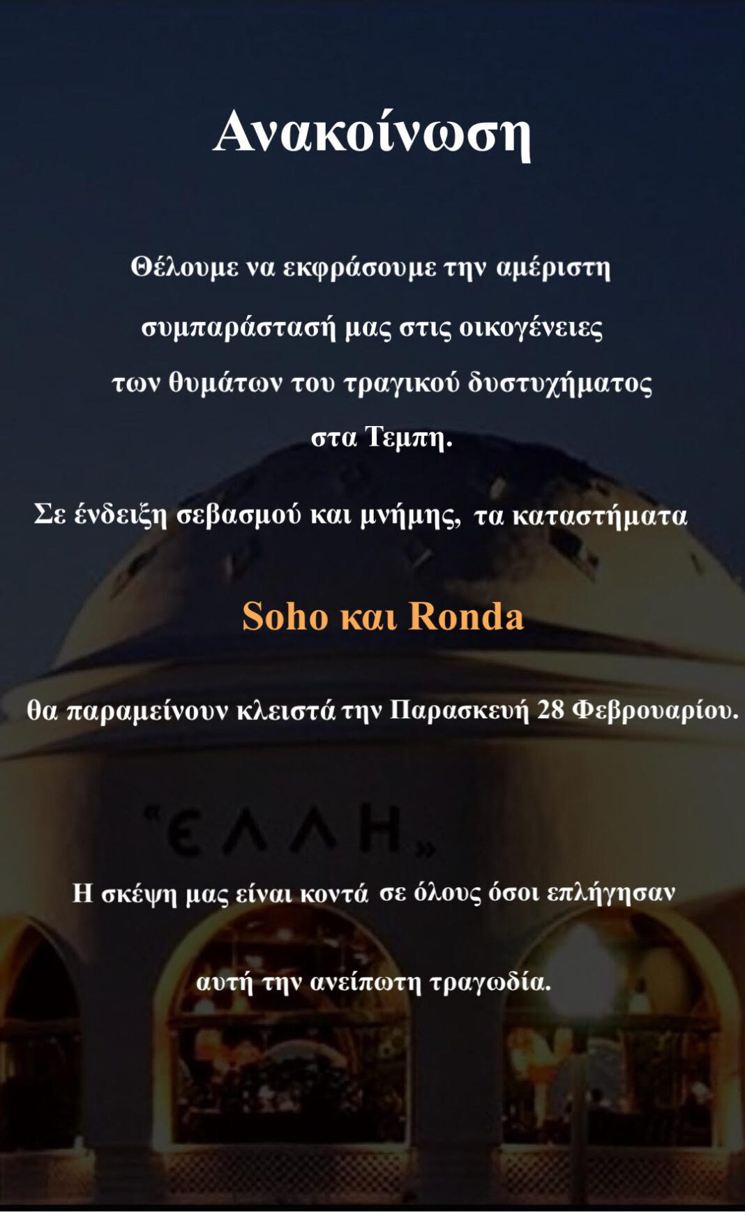 Σε ανακοίνωσή του: “Σεβόμενοι τη μνήμη των θυμάτων της τραγωδίας των Τεμπών και θέλοντας να τιμήσουμε τις οικογένειες που θρηνούν τους αγαπημένους τους, αποφασίσαμε να κρατήσουμε κλειστά τα καταστήματά μας την Παρασκευή 28 Φεβρουαρίου. Μια μέρα σαν κι αυτή, δεν είναι στιγμή για διασκέδαση, αλλά για περισυλλογή.”