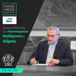Τα Νοσοκομεία Καλύμνου και Λέρου μας κατέθεσαν, σε συνεργασία με την 2η ΥΠΕ και το Υπουργείο Υγείας, την πρόταση για χρηματοδότηση νέων, σύγχρονων συστημάτων πυρασφάλειας. Οι Ευρωπαϊκοί πόροι της Περιφέρειας μας, μας επιτρέπουν την κάλυψη και αυτής της ανάγκης. Οι Ευρωπαϊκοί πόροι, που κατά προτεραιότητα οδηγούνται στην δημόσια υγεία. Προτεραιότητα—αποτέλεσμα πολιτικής απόφασης, γιατί, όπως έχουμε ξαναπεί, η πρόοδος δεν έρχεται από κραυγές αλλά από δουλειά.»