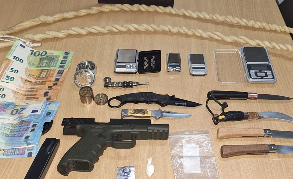 Σύμφωνα με την αστυνομία, κατά τη διερεύνηση της υπόθεσης προέκυψε ότι ο 45χρονος διατηρούσε στην κατοικία του διάφορα αντικείμενα, μεταξύ των οποίων ένα απομιμητικό πιστόλι με γεμιστήρα, έξι μαχαίρια, μικρή ποσότητα κοκαΐνης (4 γραμμάρια), τέσσερις ζυγαριές ακριβείας και δύο θρυμματιστές κάνναβης. Επιπλέον, εντοπίστηκαν δύο βούρδουλες, το χρηματικό ποσό των 900 ευρώ, συσκευή άτμισης κάνναβης και ένα φαρμακευτικό δισκίο χωρίς την απαιτούμενη ιατρική συνταγή.
