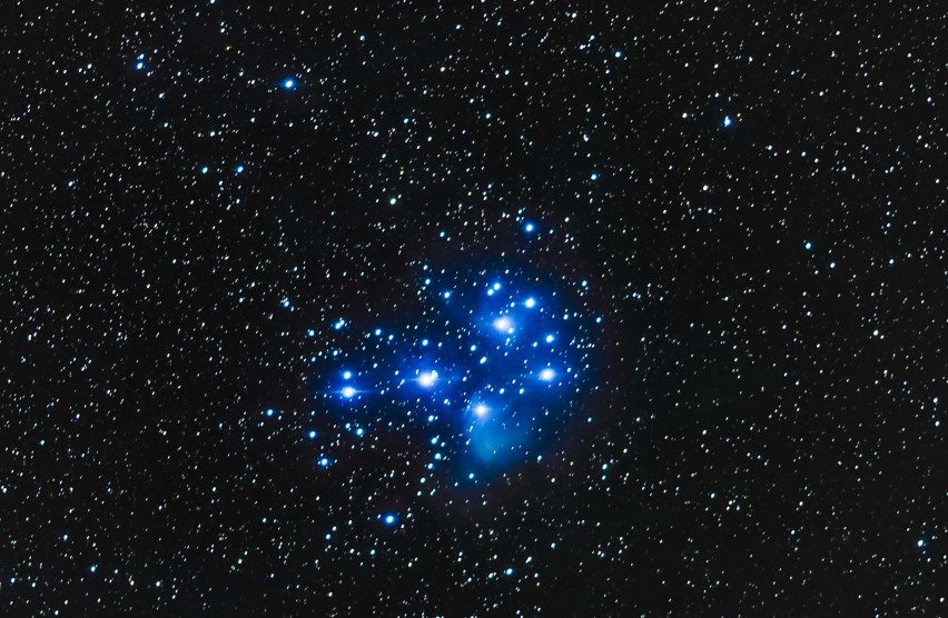 Μέσα από κιάλια, οι Πλειάδες θυμίζουν τη διάταξη των άστρων του Μεγάλου Άρκτου στον αστερισμό της Μεγάλης Άρκτου, περιβαλλόμενες από ασθενέστερα άστρα και τη φωτεινή λάμψη ενός κοντινού νεφελώματος αντανάκλασης.