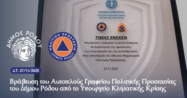 Το Αυτοτελές Γραφείο Πολιτικής Προστασίας του δήμου Ρόδου τιμήθηκε από το υπουργείο Κλιματικής Κρίσης και Πολιτικής Προστασίας για τη συμβολή του στον Εθνικό Μηχανισμό Πολιτικής Προστασίας.