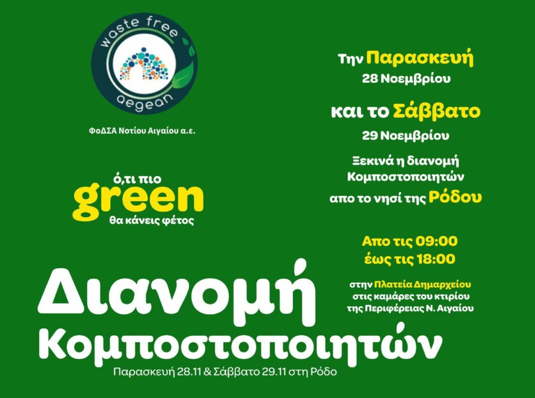 Ένα σημαντικό διήμερο για την προστασία του περιβάλλοντος ξεκινά στην Ρόδο την Παρασκευή 28 και το Σάββατο 29 Νοεμβρίου, με τη διανομή Οικιακών Κομποστοποιητών στους πολίτες που έχουν κάνει αίτηση στο σχετικό πρόγραμμα.