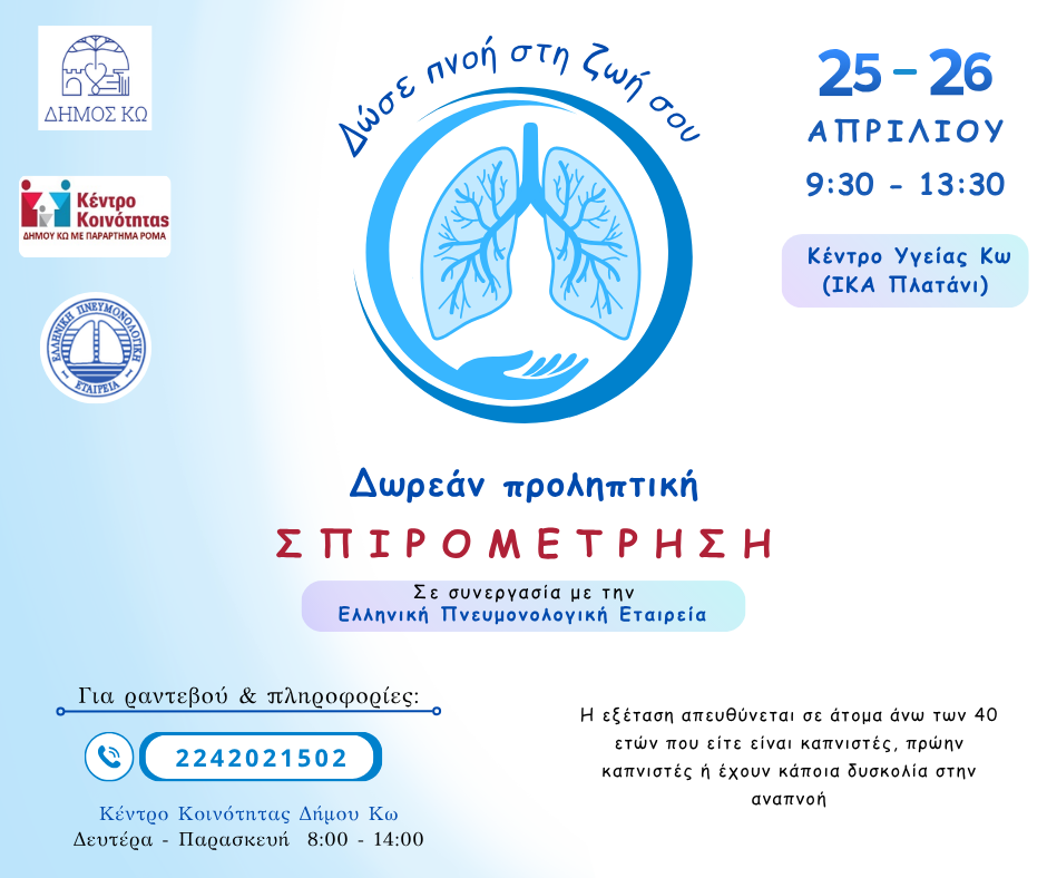 Μια νέα σημαντική πρωτοβουλία προληπτικής ιατρικής ξεκινά το Κέντρο Κοινότητας του Δήμου Κω, σε συνεργασία με την Ελληνική Πνευμονολογική Εταιρεία. Μετά την ολοκλήρωση της πασχαλινής δράσης για τα παιδιά, η κοινωνική υπηρεσία του Δήμου στρέφει την προσοχή της στην υγεία των πνευμόνων, προσφέροντας δωρεάν σπυρομετρήσεις στους κατοίκους του νησιού.