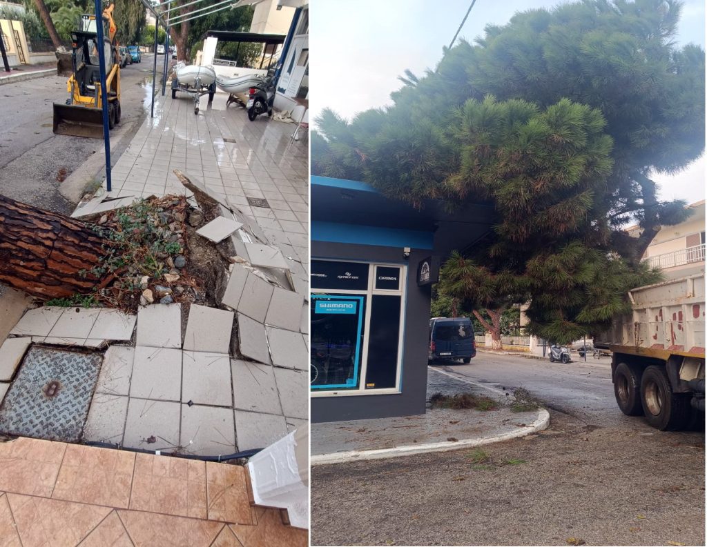 Οι ρίζες του πεύκου προκάλεσαν παράλληλα ζημιές και σε γειτονικό κατάστημα που πωλεί πανιά για ιστιοφόρα, ανασηκώνοντας τμήμα του δαπέδου.